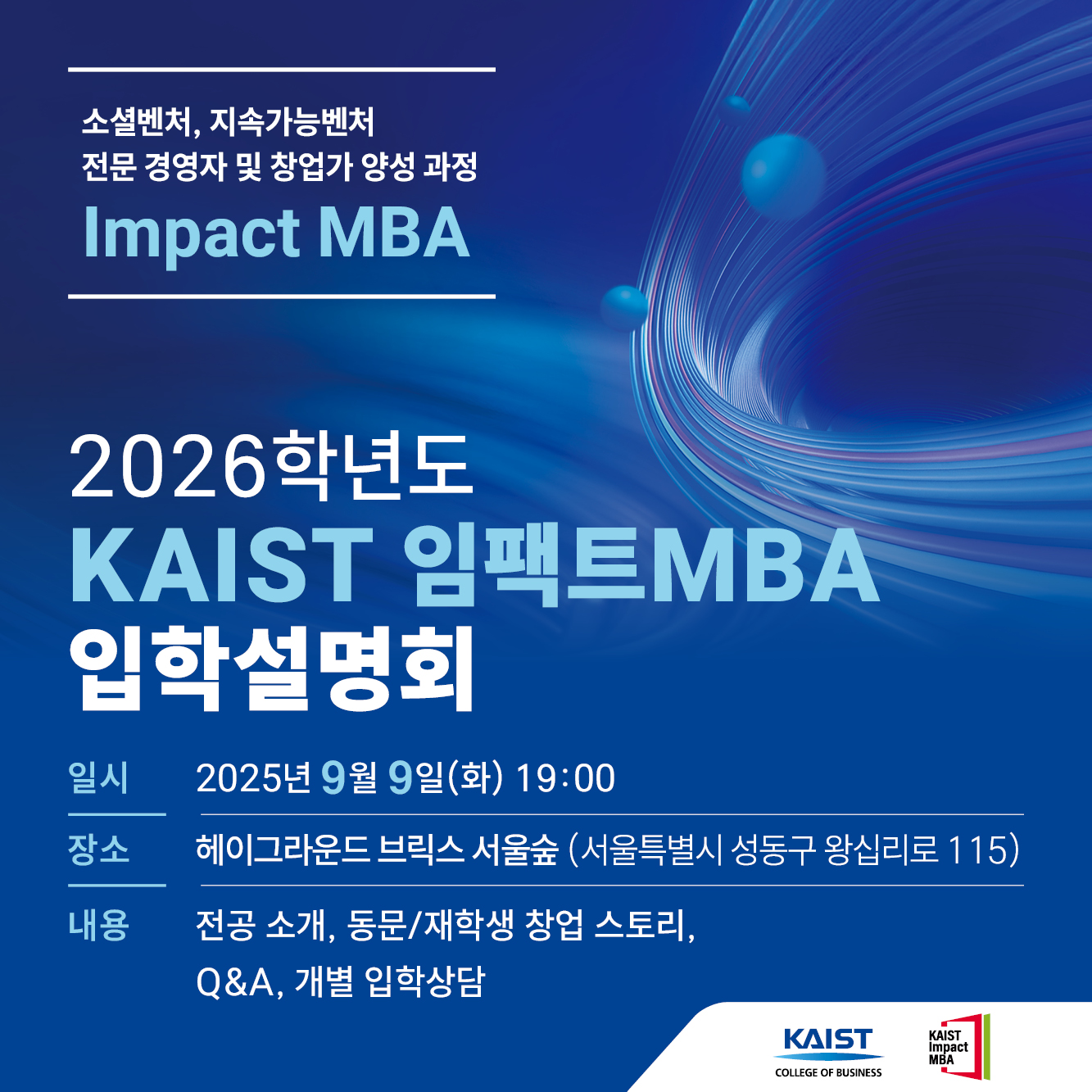 2026년 3월 Impact MBA 프로그램 시작을 앞두고 신입생을 모집하기 위한 입학설명회가 다음과 같이 열립니다. 관심이 있다면, 설명회에 참여해서 필요한 모든 정보를 얻을 수 있습니다.