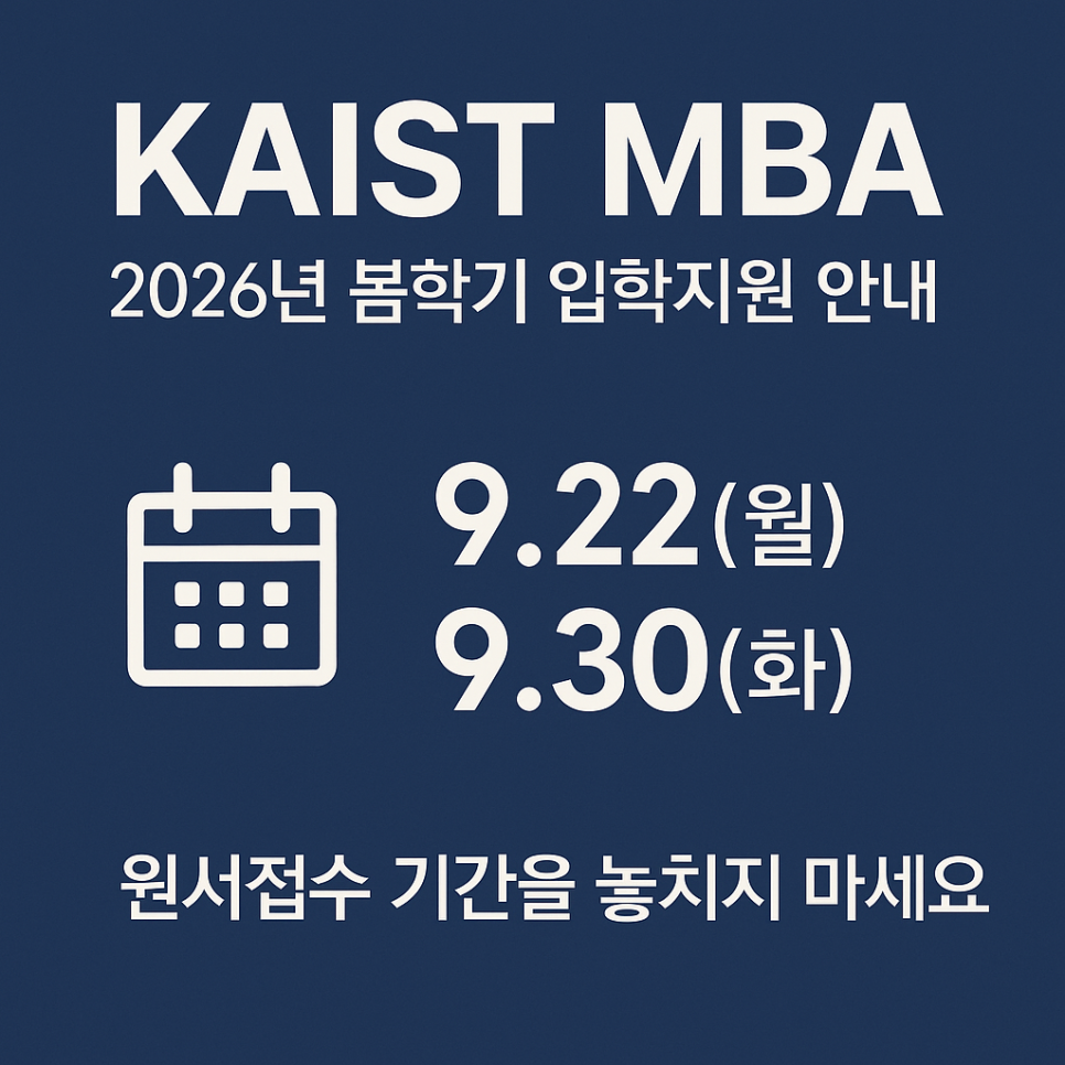 KAIST MBA는 1년에 단 한 번만 모집하기 때문에, 이번 **원서접수 기간(2025년 9월 22일~9월 30일)**을 놓치시면 다시 1년을 기다리셔야 합니다.